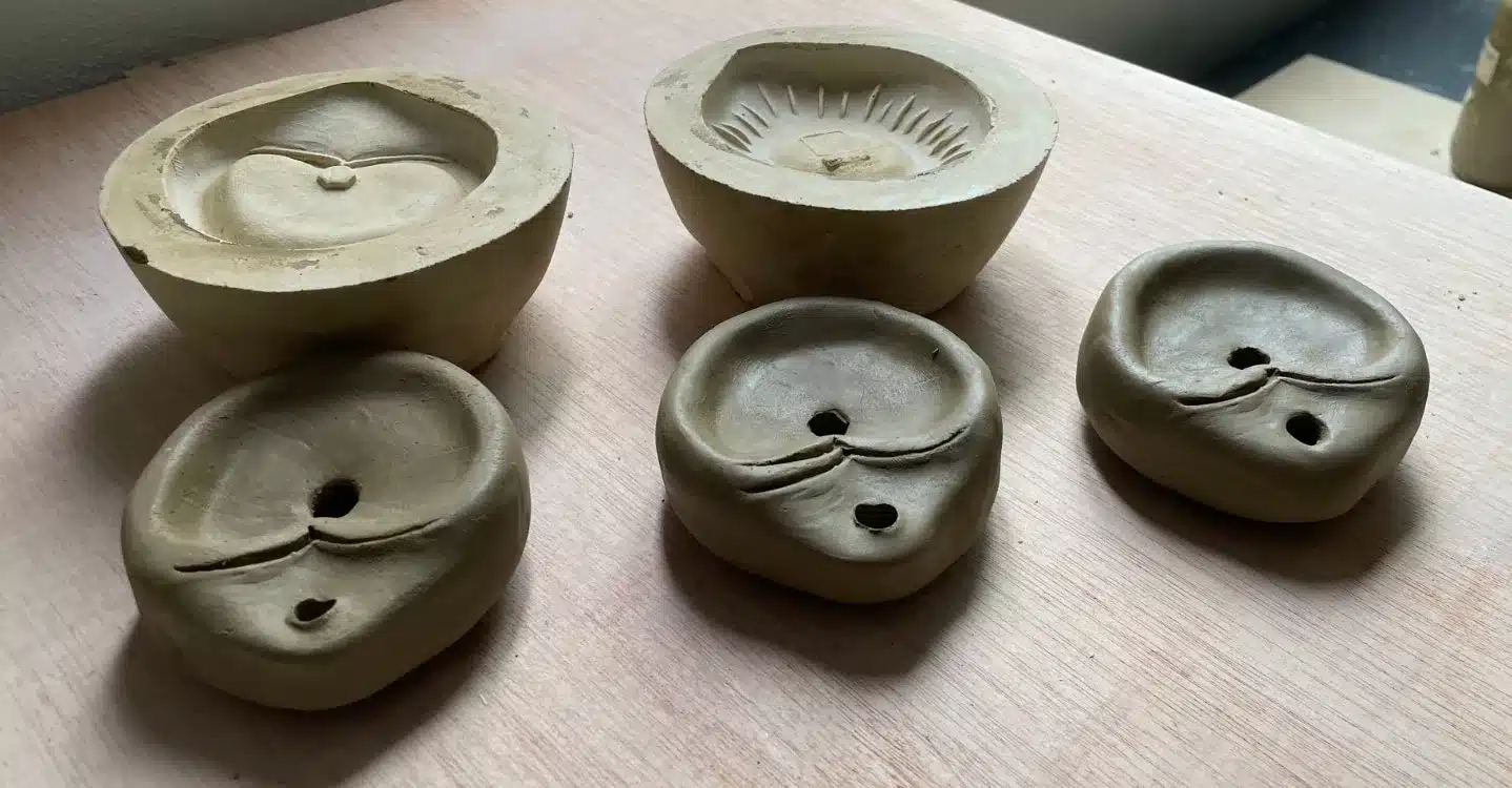 1. Modelamos el prototipo macizo según los diseños que hemos considerado previamente. Con la arcilla en estado de cuero, hemos retorneado los prototipos en el torno para rematar el repié (base), el disco y el orificio de llenado.