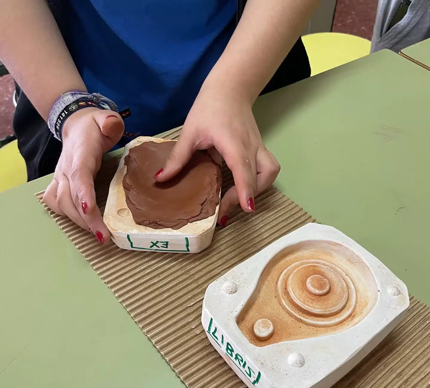 1. Colocamos una pequeña cantidad de  arcilla en forma de disco y comenzamos a presionar con los pulgares de manera ordenada hasta cubrir los huecos del molde; es necesario controlar el grosor para que sea uniforme. Si el grosor es muy fino, se fracturará; calcularemos unos 5 o 6 mm de grosor en las primeras reproducciones e iremos afinando la técnica poco a poco.