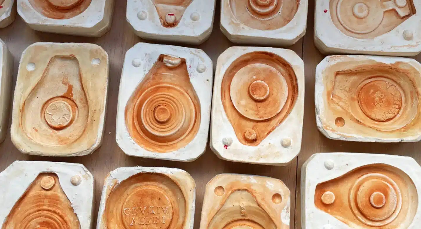 Los moldes bivalvos de escayola permiten la fabricación en serie de un mismo modelo para poder satisfacer la gran demanda de la población. Cada alfarero marcaba sus piezas con un sello (sigillum), ¿te suena de algo la cerámica «sigilata»? De ahí viene su nombre, aunque yo pienso antes en el acabado brillante del engobe utilizado para impermeabilizar las piezas.